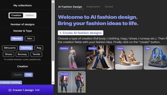 • AI-Powered Design Generation: Designers and brands can describe their fashion ideas in plain language. The AI interprets these descriptions and generates original, one-of-a-kind designs. Whether you're envisioning haute couture dresses, trendy shoes, or stylish bags, the AI technology ensures that your creations are truly unique.