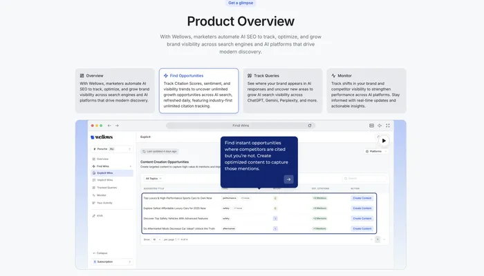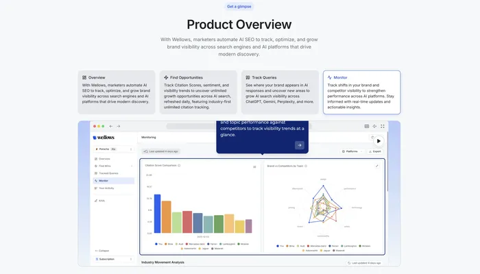 By tracking brand mentions, citations, sentiment, and competitor visibility inside AI responses, Wellows reveals how large language models perceive your brand—and why certain competitors surface instead. This enables marketing, SEO, and brand teams to adapt messaging, content strategy, and digital presence to improve AI discoverability. With Wellows, brands can move beyond guesswork and start optimizing for the next generation of search.
